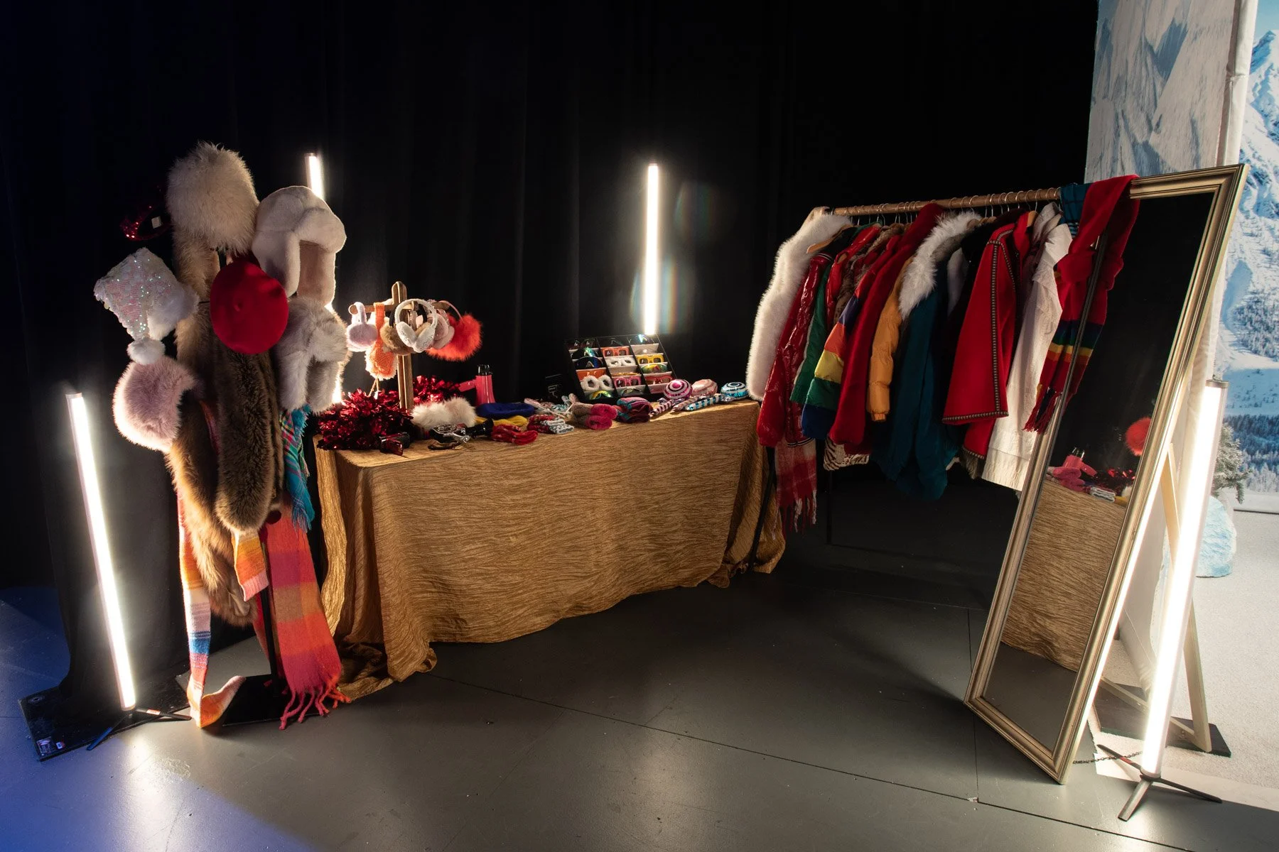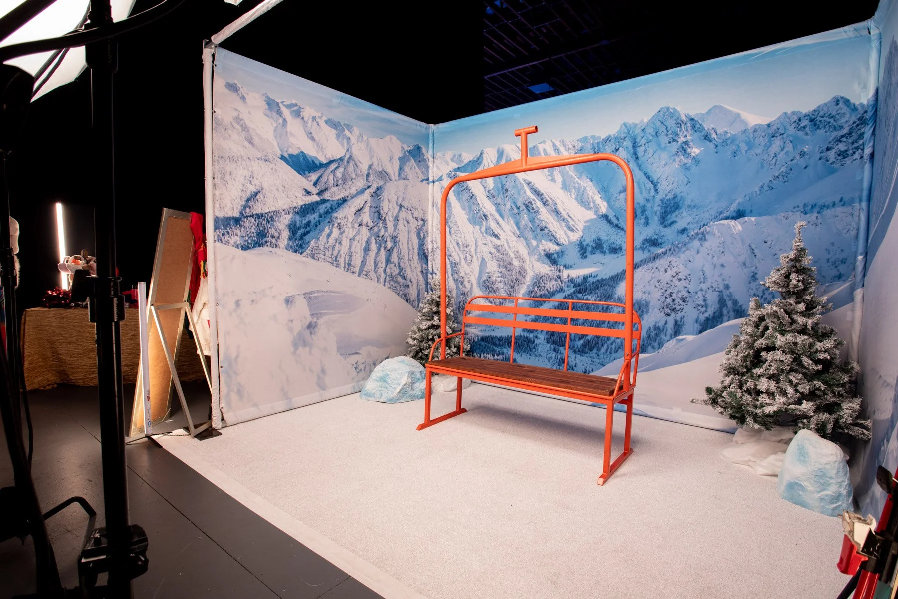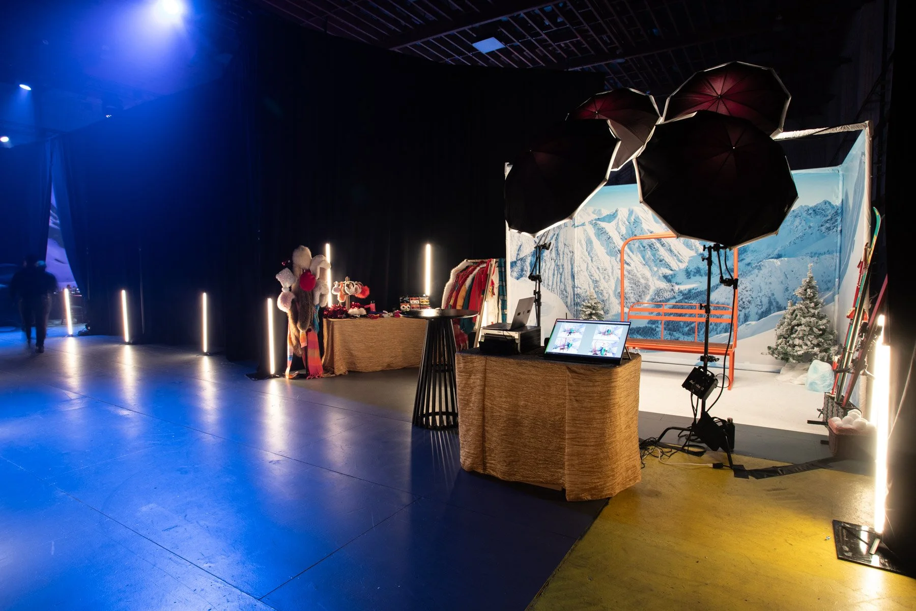 For this blowout corporate holiday party, we created a fully immersive alpine pop-up portrait studio. A custom-printed mountain panorama, handcrafted ski lift bench, snow-like white turf flooring, and winter styling props transformed the space into a playful mountaintop scene.
