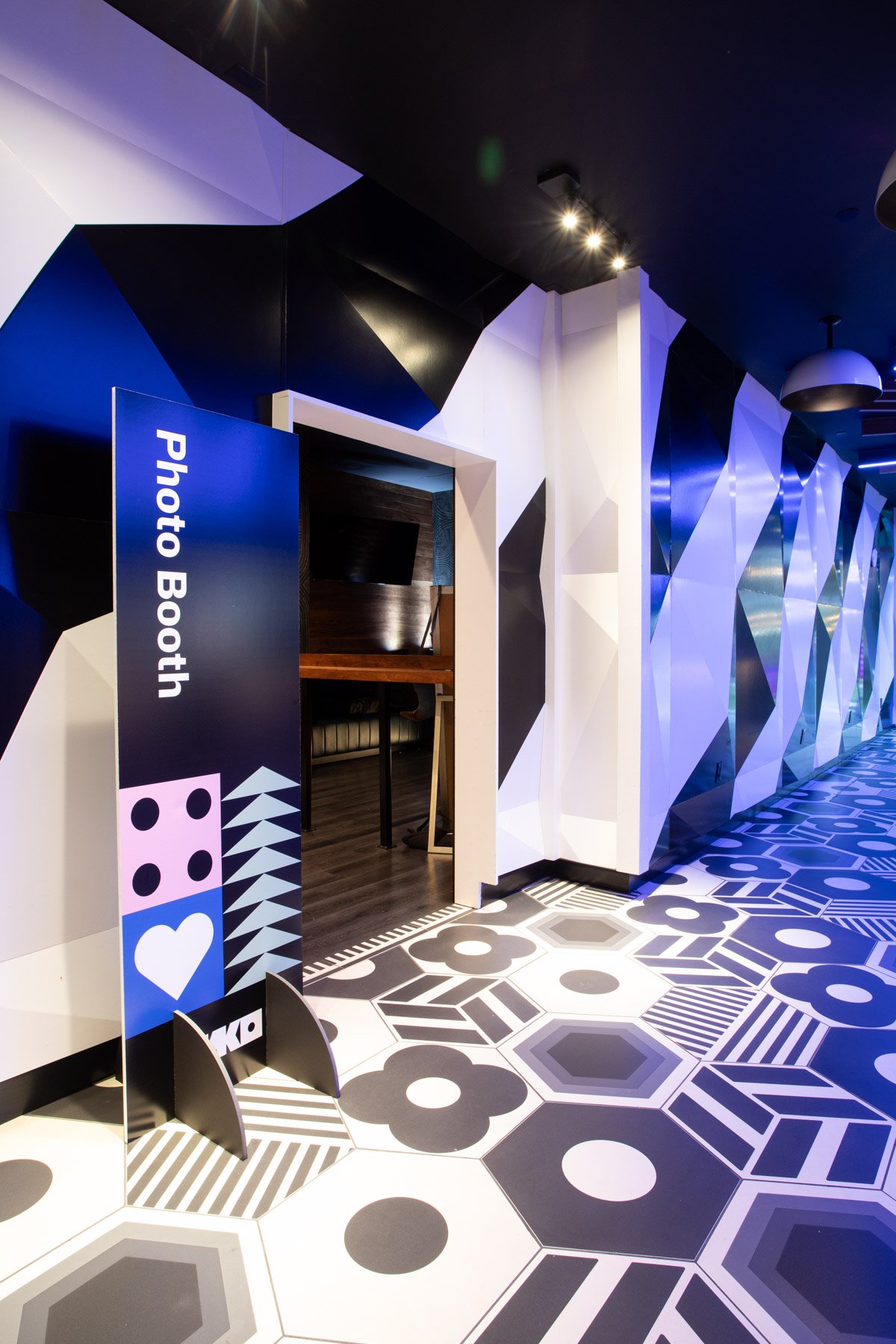 For this conference welcome reception at the Virgin Hotel in Las Vegas, we ran two simultaneous activations side by side — our Fringe Box, making its debut with bold blue fringe and matching blue floor, alongside our Silver Set.
