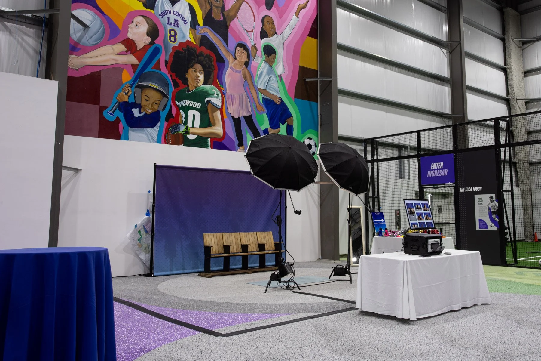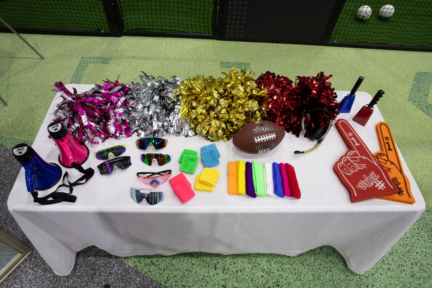 For this black-tie sports gala at the California Science Center, we set up a photo activation inside the venue's gymnasium exhibit. A blue textured backdrop and wooden stadium bench seats set the scene, with a full spread of sports props—footballs, basketballs, foam fingers, megaphones, pom-poms, headbands, and sport shades. Guests in formal wear grabbed their prop of choice and brought serious game day energy to the studio.