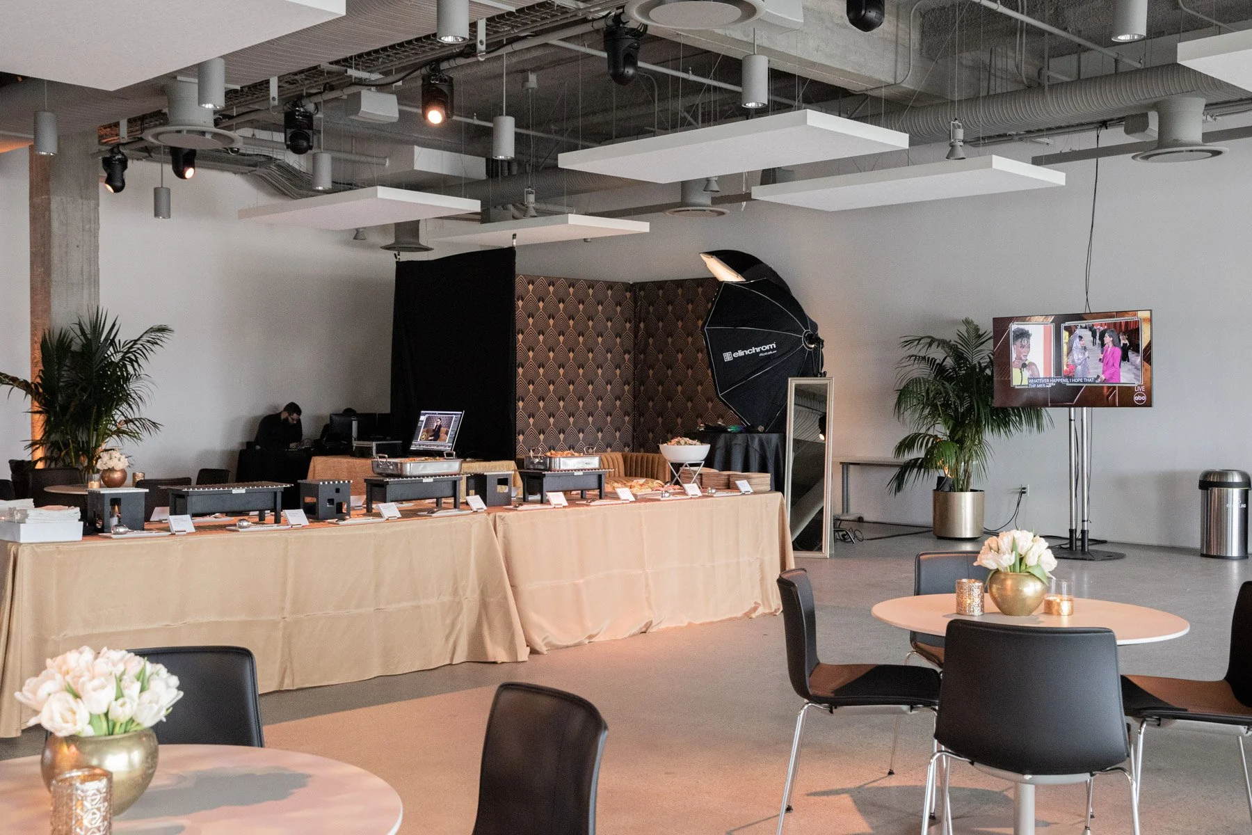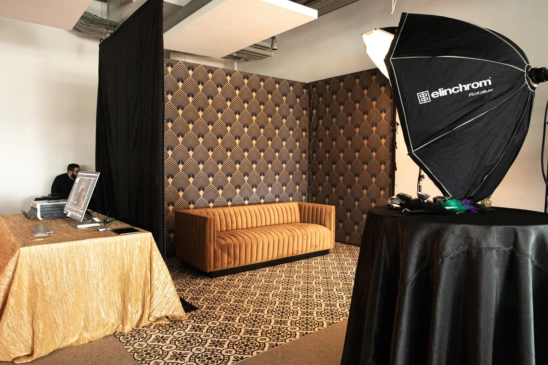 We brought out our signature Gatsby Photo Parlor. The art deco backdrop is printed on fabric and so luxe. The flooring brought a vibe of its own but let the gold velour sofa shine.