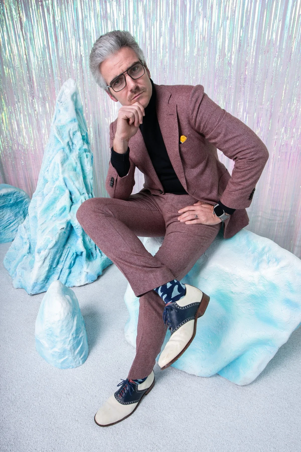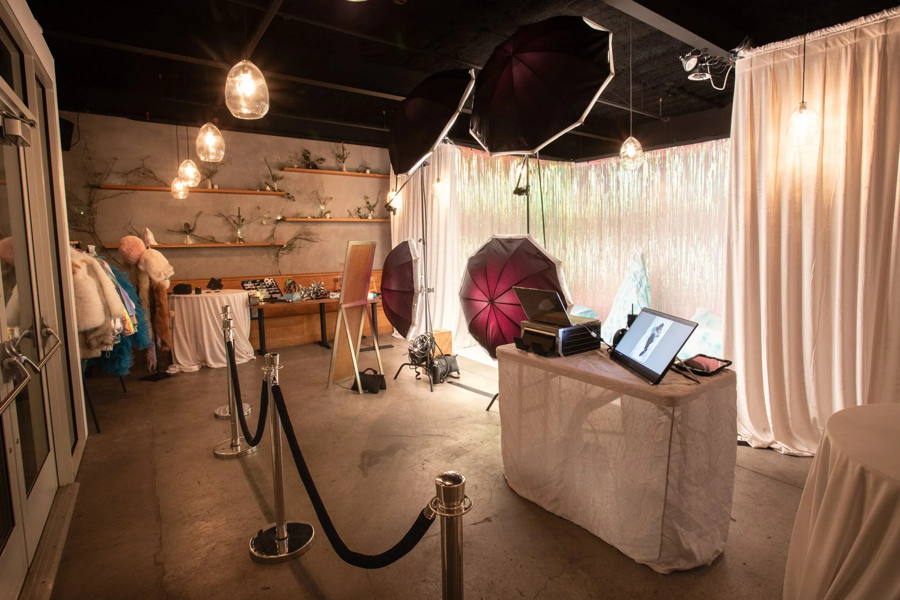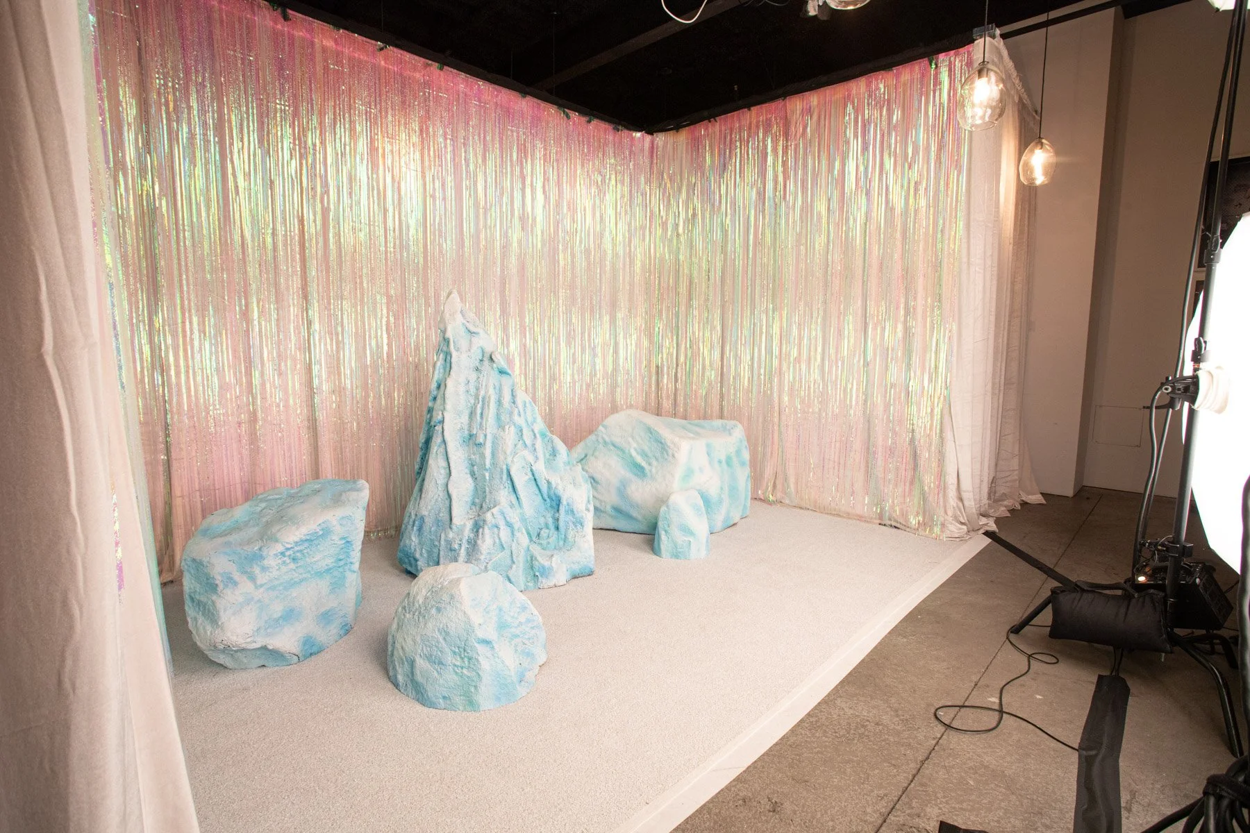 For this corporate holiday party at Minnesota Street Project in San Francisco, we transformed our Fringe Box into a glittering ice cave . A floor-to-ceiling iridescent fringe backdrop, ice-white velvet draping, white astroturf flooring, and custom-sourced glacier rock sculptures built out the scene. Guests layered into bold styling — fur stoles, metallic puffers, ski goggles, and crystal crowns — and served looks cold enough to match. 🧊✨