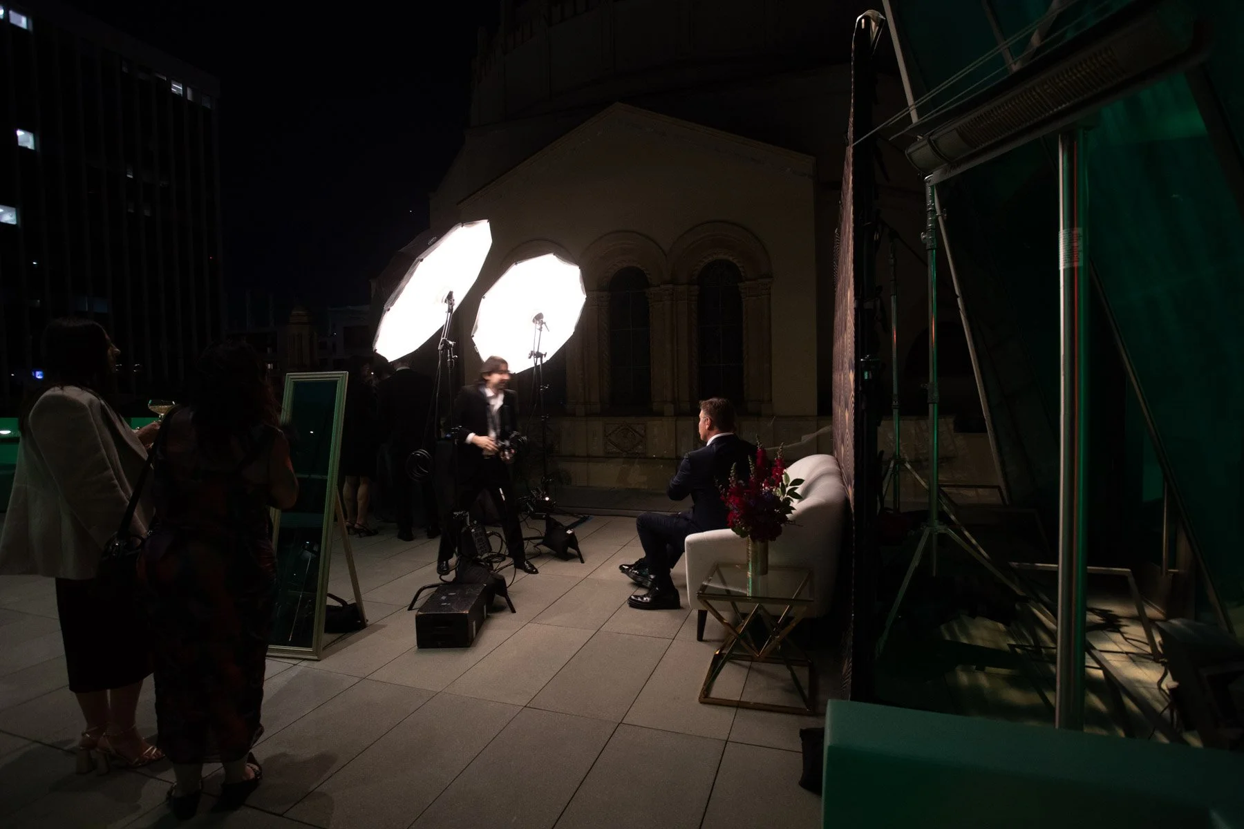 For this USC Dornsife gala honoring Director Bob Shrum, we set up our Gatsby backdrop on an open-air terrace — a bold navy and gold geometric design that matched the elegance of the evening. Guests settled into the plush white sofa alongside rich floral arrangements and stepped away with polished, magazine-worthy keepsakes.
