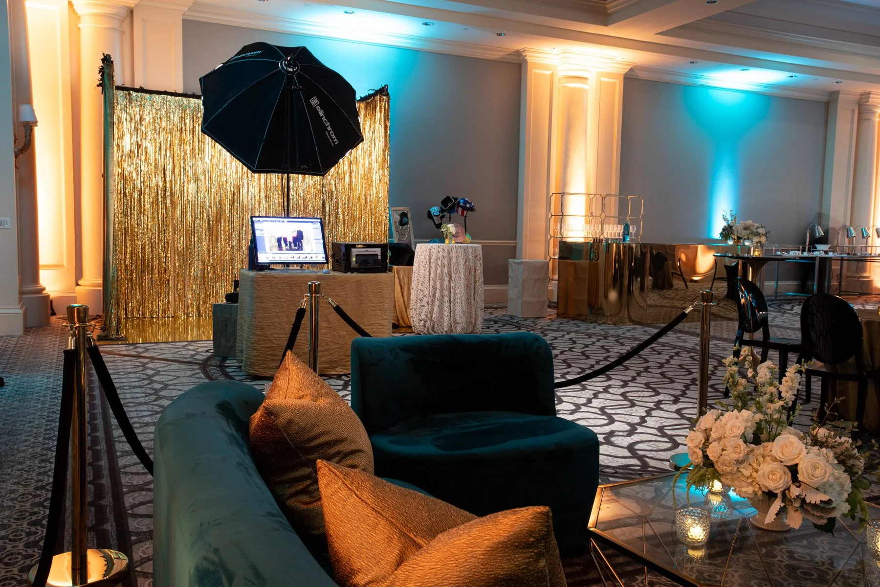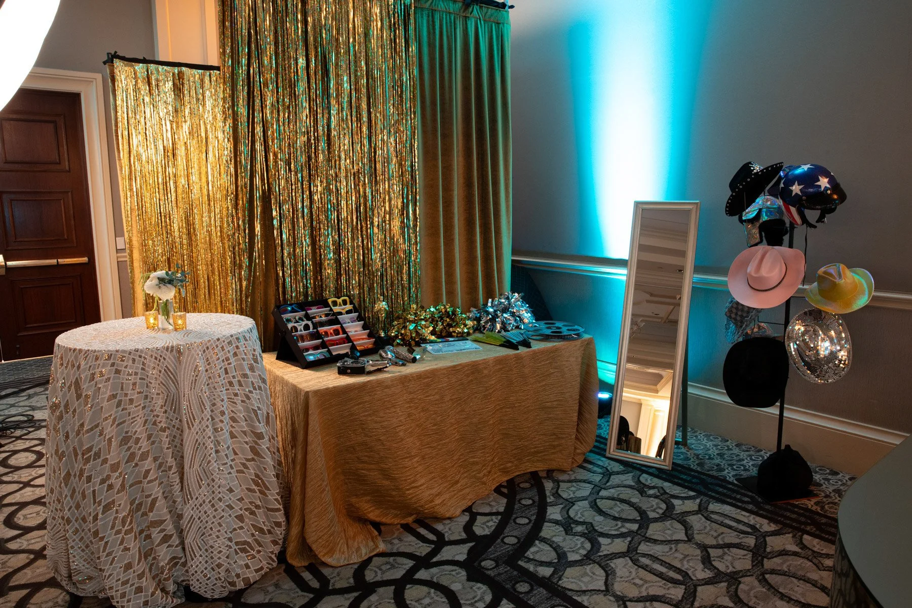 For this Old Hollywood-themed corporate party at the Waldorf Astoria in Dana Point, we set up our Fringe Box dressed in gold holographic fringe, rich gold velvet draping, and a gleaming gold floor — a perfect match for the glamour of the evening. A curated prop selection leaned fully into the theme, including the debut of our vintage film reel alongside clapperboards, retro cameras, and award trophies. 🎬✨