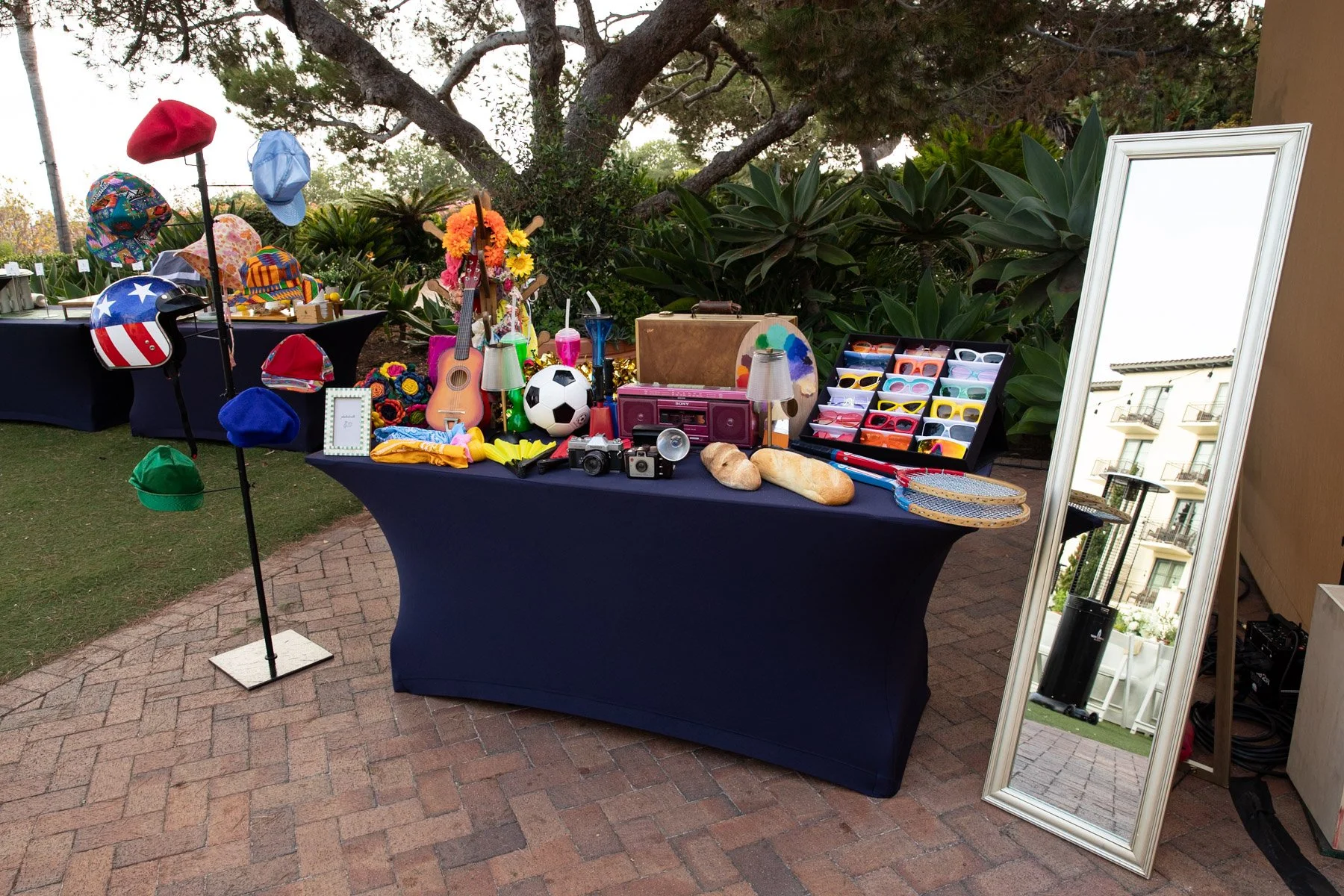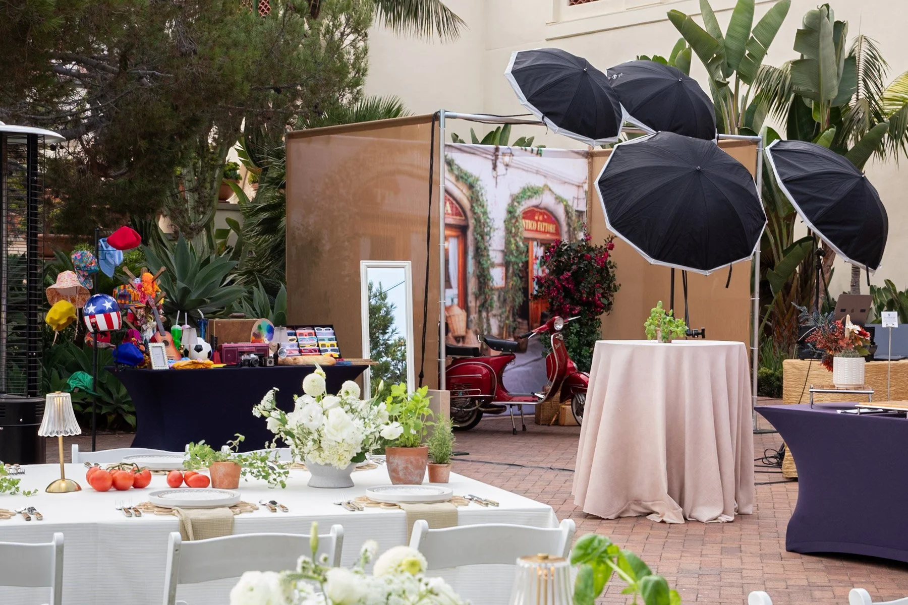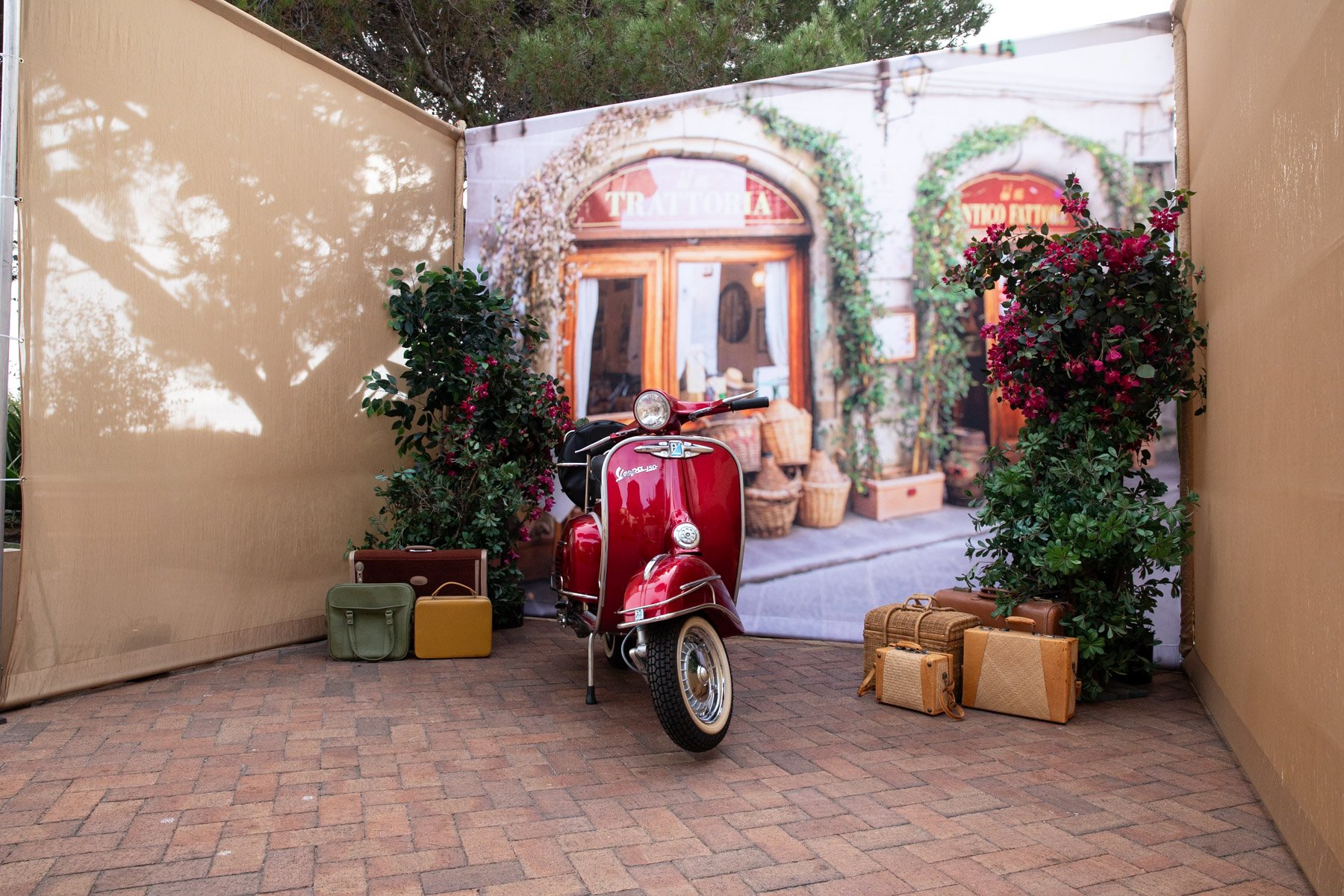 A custom dye-sublimation printed backdrop set the stage, anchored by a pristine vintage red Vespa we sourced for the occasion. Lush greenery, stacked travel trunks, and playful Riviera-inspired props invited guests to channel carefree vacation energy—striking effortless portraits that felt somewhere between a Roman holiday and a stylish summer road trip. 🇮🇹🛵📸